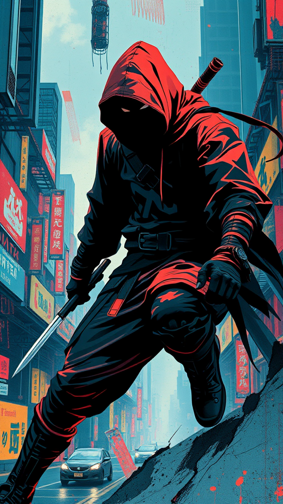 A stealthy ninja, cloaked in shadows, deftly navigating a futuristic urban landscape, rendered in the distinctive style of Takeshi Murata with vibrant colors and abstract forms, the vertical composition capturing the essence of movement and mystery, augmented with a touch of surreal distortion, exuding an enigmatic yet dynamic aura.