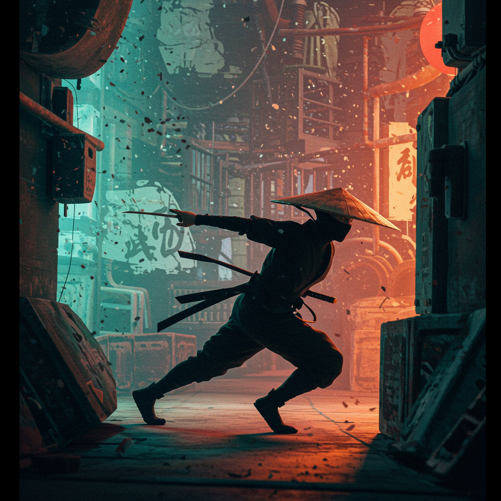 A stealthy ninja cloaked in shadows, moving with the fluidity and precision characteristic of Takeshi Murata's art, set against a vertical canvas ratio. The scene is imbued with dynamic motion and vivid colors, highlighting the contrast between darkness and light. The environment features abstract urban elements with a hint of futuristic aesthetics, enhancing the mysterious aura of the ninja. Emphasize the interplay of textures and surreal elements, merging tradition with modernity in a captivating visual style.