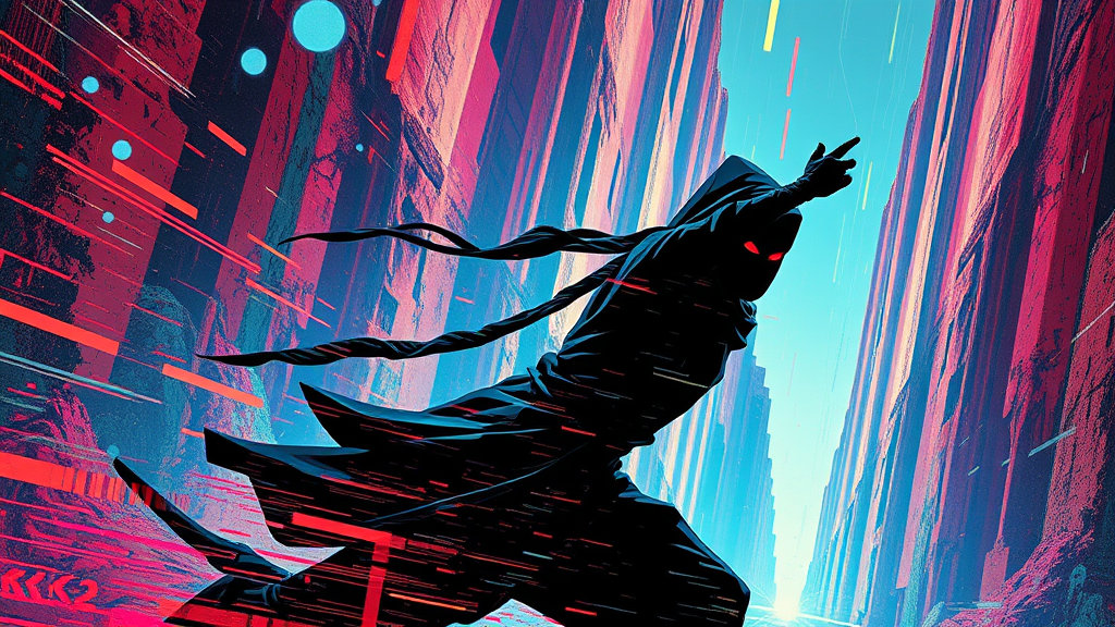 A stealthy ninja gracefully poised amidst vibrant, glitch-inspired digital distortions, their form elegantly elongated in a surreal, abstract composition evocative of Takeshi Murata's avant-garde style. The scene plays with bold, saturated colors and kinetic energy, capturing the essence of swift motion and shadowy intrigue, set against an elongated vertical landscape rich with textures and layers, alluding to an enigmatic narrative in a heightened, stylized visual language.