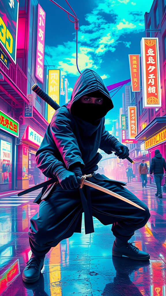 A stealthy ninja shrouded in mystery, depicted in the vibrant and glitch-inspired style of Takeshi Murata, poses amidst an abstract, neon-lit urban landscape with dynamic energy. The scene captures a blend of traditional ninja elements with a futuristic twist, highlighting sleek, reflective surfaces and vivid colors that create a sense of movement and depth, under a sky saturated in electric hues that blur the boundaries between reality and a digital realm.