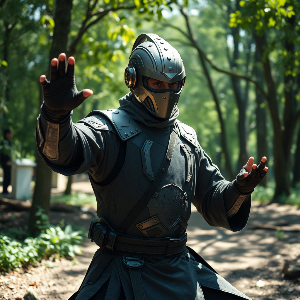 A stealthy warrior cloaked in sleek, modern armor, his face hidden beneath an intricate helmet, listens to the soothing strains of classical music through futuristic wireless headphones. Amid a tranquil forest clearing, he gracefully performs Tai Chi, each deliberate movement synchronized with the melodic flow, his actions a harmonious blend of strength and serenity. Nearby, sunlight filters through the leaves, casting a pattern of dappled light across his protective suit, enhancing the surreal elegance of his practice.