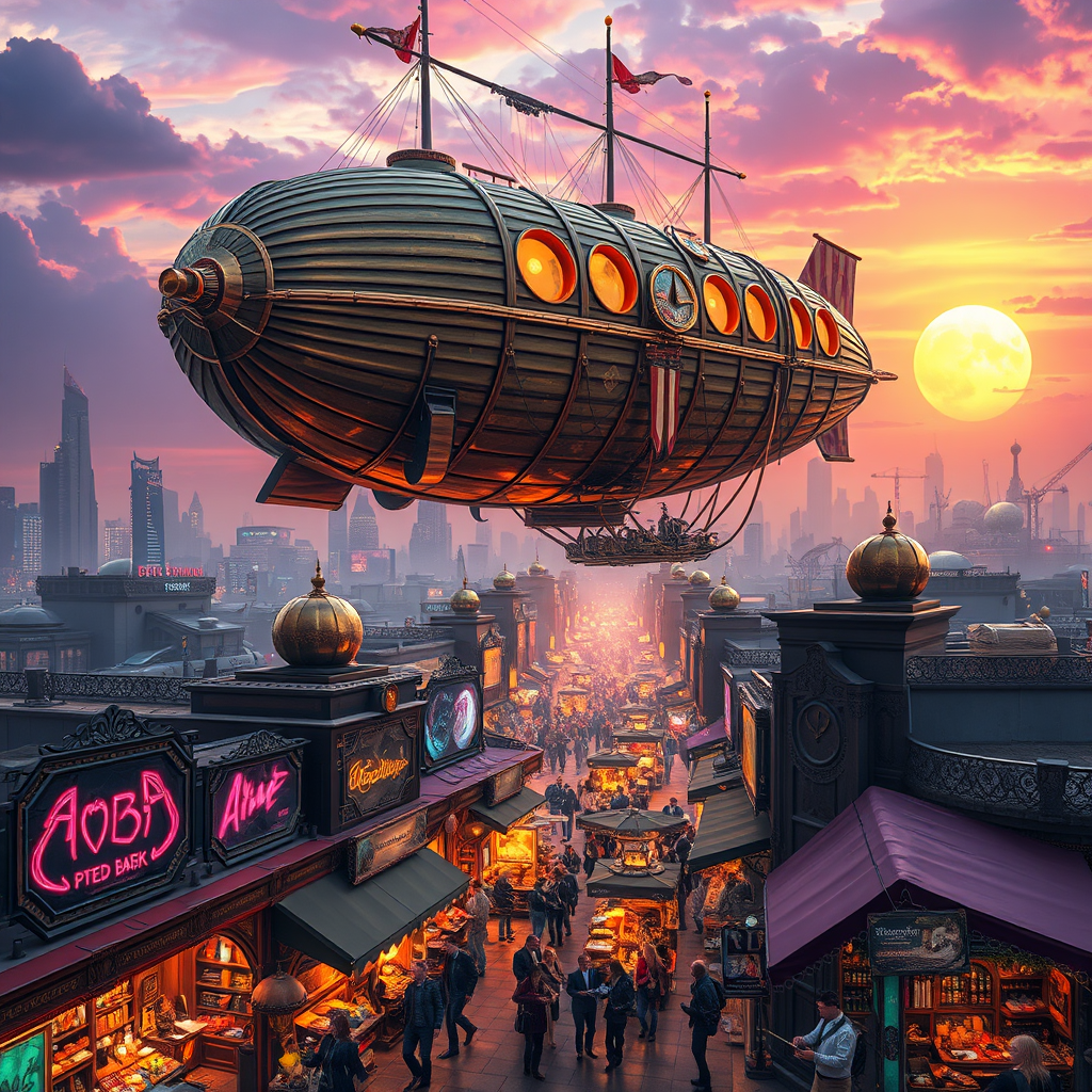 A steampunk airship floating above a futuristic metropolis, combining Victorian elegance with neon cybernetic elements, where elegantly dressed passengers peer through brass telescopes at holographic billboards and flying cars, while below, a street orchestra of AI musicians performs in a bustling bazaar filled with art nouveau stalls offering exotic goods from parallel dimensions, rich textures of leather, glass, and metal reflecting a setting sun that paints the sky in shades of electric purple and gold.