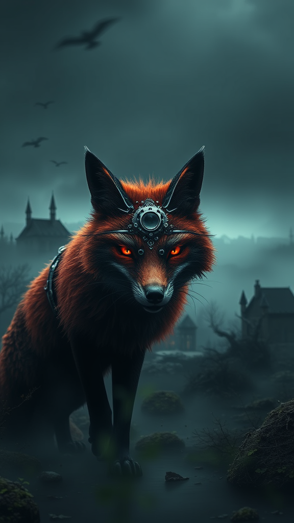 A steampunk crimson fox emerges from the mist, its mechanical features glinting ominously under the atmospheric gothic horror backdrop. In the distance, eldritch landscapes unfold like scenes from a Lovecraftian nightmare, shrouded in dark lighting and heavy shadows. The scene captures a wide-angle vista, rendered with hyper-realistic details using Unreal Engine's ray tracing technology. Soft natural light contrasts with the drama of volumetric and cinematic lighting, casting intricate patterns on the fox's lush fur. This digital masterpiece conveys a sense of unreality, as if from a D&D fantasy, trending on ArtStation for its photorealism and excessive detailing. Sharp focus highlights the detailed steampunk elements, while a magic aura of photorealism bathes the scene in an otherworldly glow, with smooth, hyper-detailed textures and dynamic shadow play.