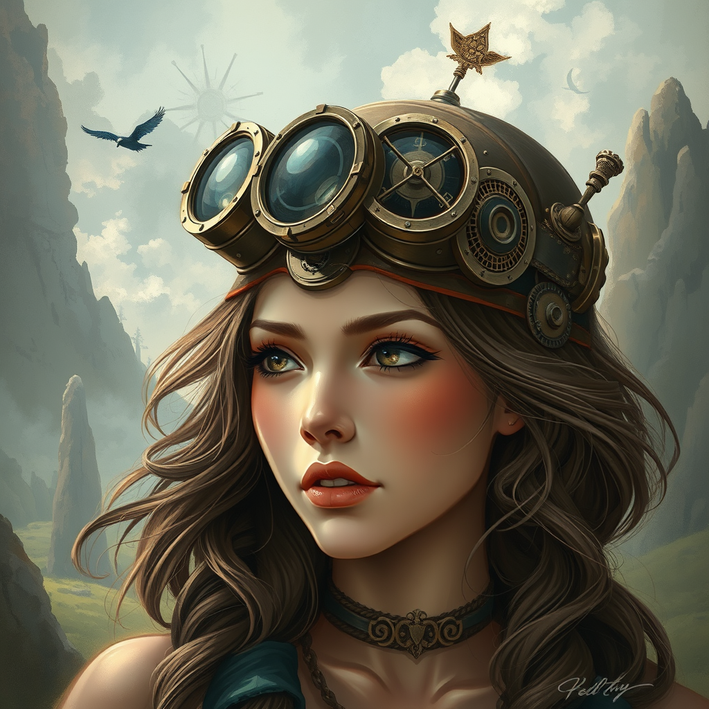 A steampunk-inspired woman with intricate goggles perched on her head, crafted with metallic ornate details, surrounded by a mystical landscape, painted in the style of Rudy Siswanto, combining fantasy art with a touch of realism, her hair cascading in loose waves, adorned with subtle hints of mystical symbols, her expression thoughtful and adventurous, evoking a sense of wonder and exploration.