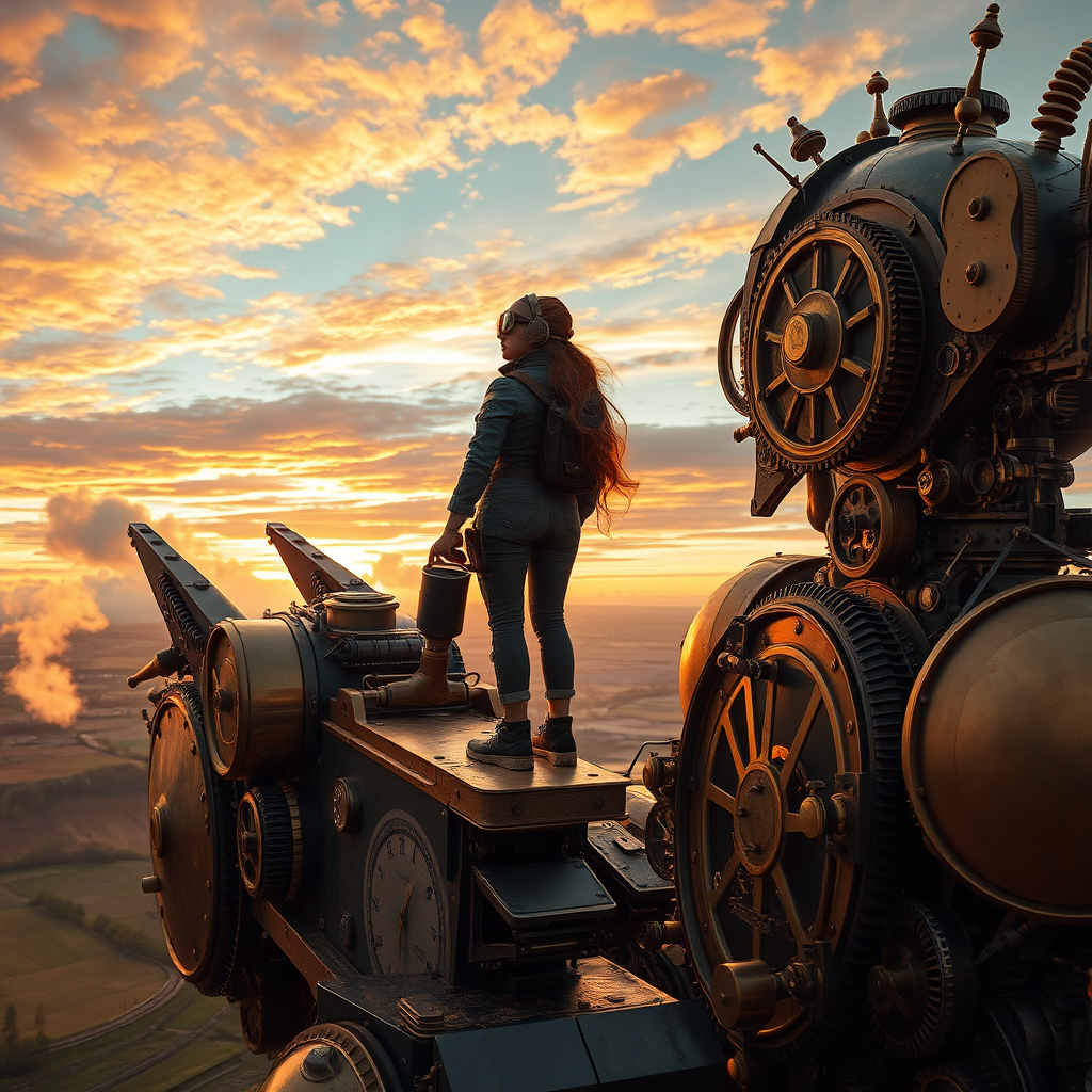 A steampunk mecha pilot gazes out at the horizon, standing proudly on the broad shoulder of her towering clockwork giant, its intricate gears and polished brass gleaming in the warm sunset. The pilot's goggles reflect the vibrant hues of the sky, echoing a sense of wonder and accomplishment. Around her, billowing steam and the faint ticking of cogs create a symphony of mechanical life. The landscape below is a patchwork of verdant fields and twisting iron tracks, a testament to the seamless blending of nature and machine. In this quiet moment, she marvels at the harmonious beauty of it all, a masterpiece of engineering and imagination.