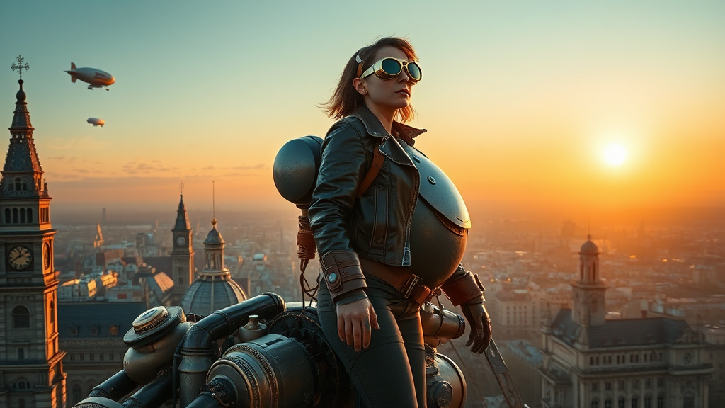 A steampunk mecha pilot with intricate goggles and a leather jacket stands confidently on the shoulder of her towering mechanical colossus, intricately designed with brass gears and steam billowing from its joints. The setting sun casts a warm golden hue over the landscape, highlighting the pilot's awe as she gazes at the vibrant cityscape below, where airships gently float among ancient clock towers. The scene is a breathtaking fusion of Victorian elegance and industrial might, capturing the endless possibilities of a world where steam-powered marvels reign supreme.
