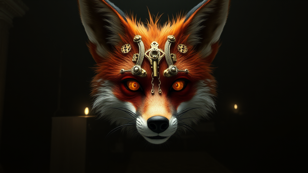 A steampunk red fox emerges from the shadows, adorned with intricate brass gears and ornate mechanical accessories. Its eyes glow with an otherworldly luminescence, casting an eerie light in the dim, heavily shadowed environment. This Lovecraftian creature is rendered in hyper-realistic detail, with a lush fur texture and a cunning, intelligent expression. The dark atmosphere is pierced by soft, natural lighting that highlights the fox's surreal features. The composition is wide-angle, reminiscent of a digital painting yet bearing the clarity of a high-definition photograph created with unreal engine precision. Magic seems to shimmer around the fox, enhancing the dramatic lighting and cinematic rays. The scene is deeply detailed, reflecting a blend of fantasy and horror, as if pulled from a Dungeons & Dragons campaign. This piece thrives on artstation, where its concept art design and exquisite craftsmanship highlight its contemporary style. The excessive detailing and volumetric lighting add depth, presenting a creature born from a world where magic and technology intertwine, accentuated by a sharp focus and hyper-detailed aesthetic.