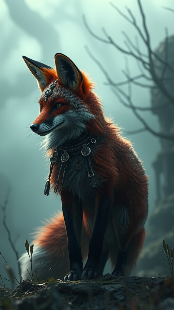 A steampunk scarlet fox stands amidst a mist-laden landscape, exuding an air of atmospheric gothic horror. The scene is influenced by Lovecraftian elements, unfolding in a universe crafted with unreal engine precision and ray tracing technology. The setting is filled with hyper-detailed, dark lighting and heavy shadows that evoke a sense of impending dread. This wide-angle digital art piece combines the realism of painting with elements of DnD lore, gaining traction on artstation. Bathed in soft natural lighting, the fox is captured as if in a portrait, surrounded by magical photography elements and dramatic lighting. The intricate, photorealistic scene is overflowing with excessive details, creating an immersive concept art experience. Smooth yet sharply focused, this artwork masterfully employs volumetric lighting and cinematic lights to enhance its steampunk aesthetic.