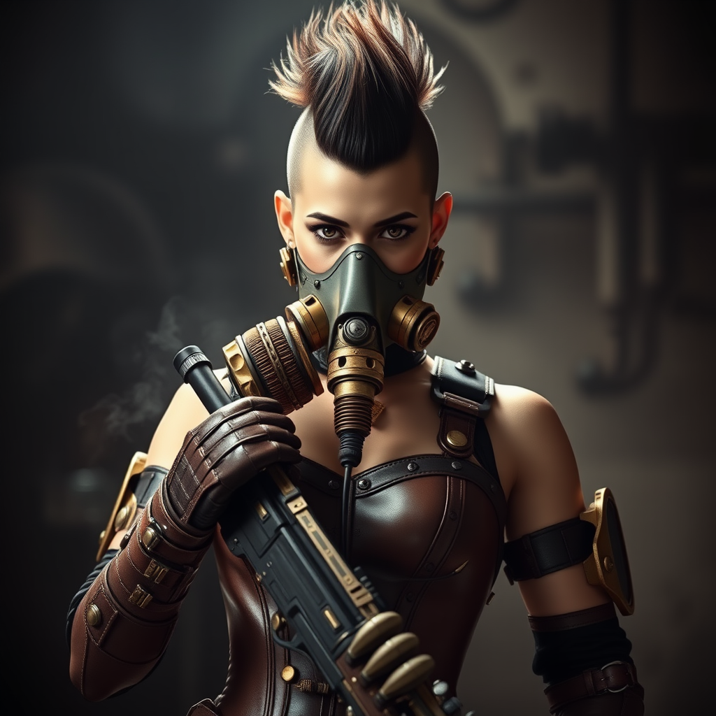 A steampunk warrior woman stands poised, her sharply styled mohawk contrasting with the intricate brass and leather elements of her attire. Her face is partially obscured by an elaborate breathing apparatus adorned with delicate gears and valves, lending her an air of enigmatic mystery. Clad in a meticulously crafted corset and armored gauntlets, she exudes both elegance and strength. Her weapon, a fusion of Victorian elegance and mechanical precision, gleams under the dramatic chiaroscuro lighting. The setting is atmospheric, reminiscent of a bygone industrial age, where steam and shadows intermingle. The hyperrealistic detail captures every rivet and stitch, creating a photorealistic scene with cinematic depth and richness. Her presence, intensified by the dynamic play of light and shadow, embodies the expressive, unreal essence of a world where fantasy and machinery entwine.