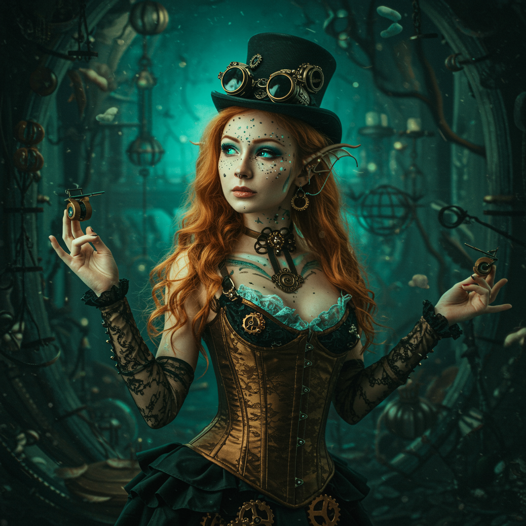 A steampunk woman in a fantastical setting, inspired by Bella Kotak's ethereal style, blending gold and cyan tones. The image captures a dark fairy tale atmosphere with photorealistic details. In the style of Artgerm, the scene includes intricately detailed miniatures. The woman possesses a sense of surreal beauty with a blend of elegance and fantasy despite elements of imperfection such as skin spots and asymmetry. Her steampunk attire features gears and cogs, with elements suggesting an alternate reality. The setting is mysterious, incorporating shadows and whimsical structures. The image portrays unique creativity while subtly hinting at elements of surrealism and fantasy narrative. The anatomy, though distinct, is artistically expressive, with a focus on imaginative and unusual aspects.