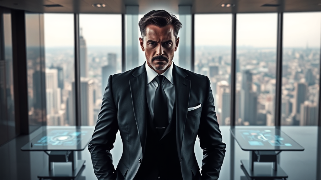 A stern-faced entrepreneur clad in sleek business attire stands in a spacious, modern office, his persona echoing the essence of Ironman. The room is basked in dramatic, contrasting light, casting sharp shadows that highlight his determined expression and the sharp angles of his designer suit. Behind him, the expansive cityscape sprawls out, a fusion of steel and glass, mirroring the visionary world he dominates. Holographic displays glow subtly on his desk, revealing cutting-edge technological blueprints and financial data, emphasizing his status as a tech mogul. A sense of ambition and innovation radiates from his stance, suggesting a man who thrives on challenges and the relentless pursuit of success.