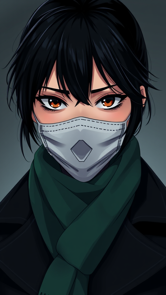 A stern-faced woman with jet-black hair, wearing a dark overcoat and an emerald scarf, is depicted with a cloth face mask in an expressive anime 3D style, rendered in stunning 8k resolution using Unreal Engine, maintaining an air of mystery and sophistication with a cinematic 9:16 aspect ratio, incorporating subtle yet impactful artistic adjustments.