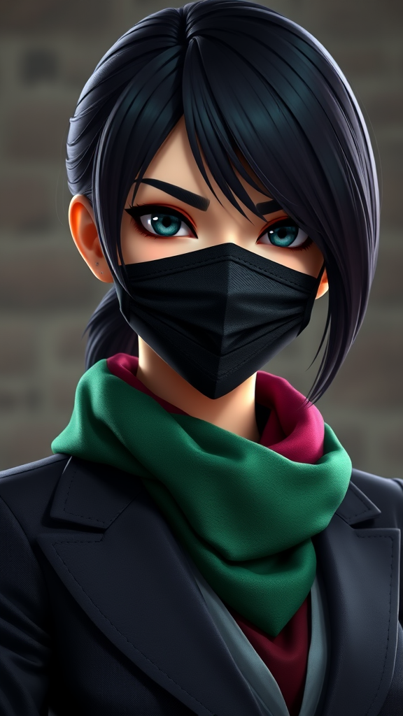 A stern-faced woman with sleek raven hair, wearing a tailored dark blazer and a vibrant emerald scarf, complemented by a stylish cloth face mask, anime 3D, rendered in ultra-realistic 8K using Unreal Engine, portrait aspect ratio, with an expressive and dynamic visual style showcasing vibrant details and captivating depth.