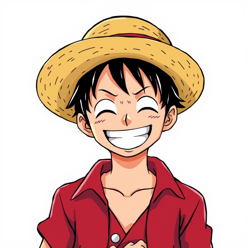 A sticker of Monkey D. Luffy from One Piece, wearing his iconic straw hat, exuding happiness and a sense of accomplishment, illustrated in anime style with a minimalist design, capturing the essence of current trends on ArtStation, featuring a bright color palette and subtle details to emphasize his cheerful and adventurous spirit.