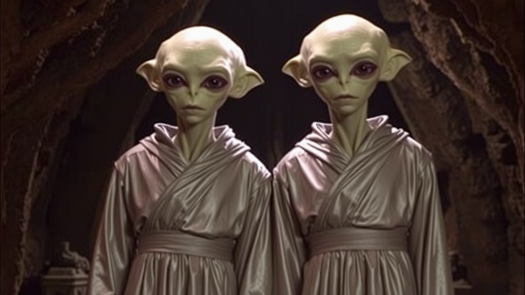 A still from a classic sci-fi series, depicting two alien humanoid twins in silvery robes, standing side by side in a mysterious, dimly lit cave environment. They have oversized heads and are facing forward, capturing the essence of vintage sci-fi television. The setting is atmospheric and evocative, emphasizing the otherworldly nature of the scene.