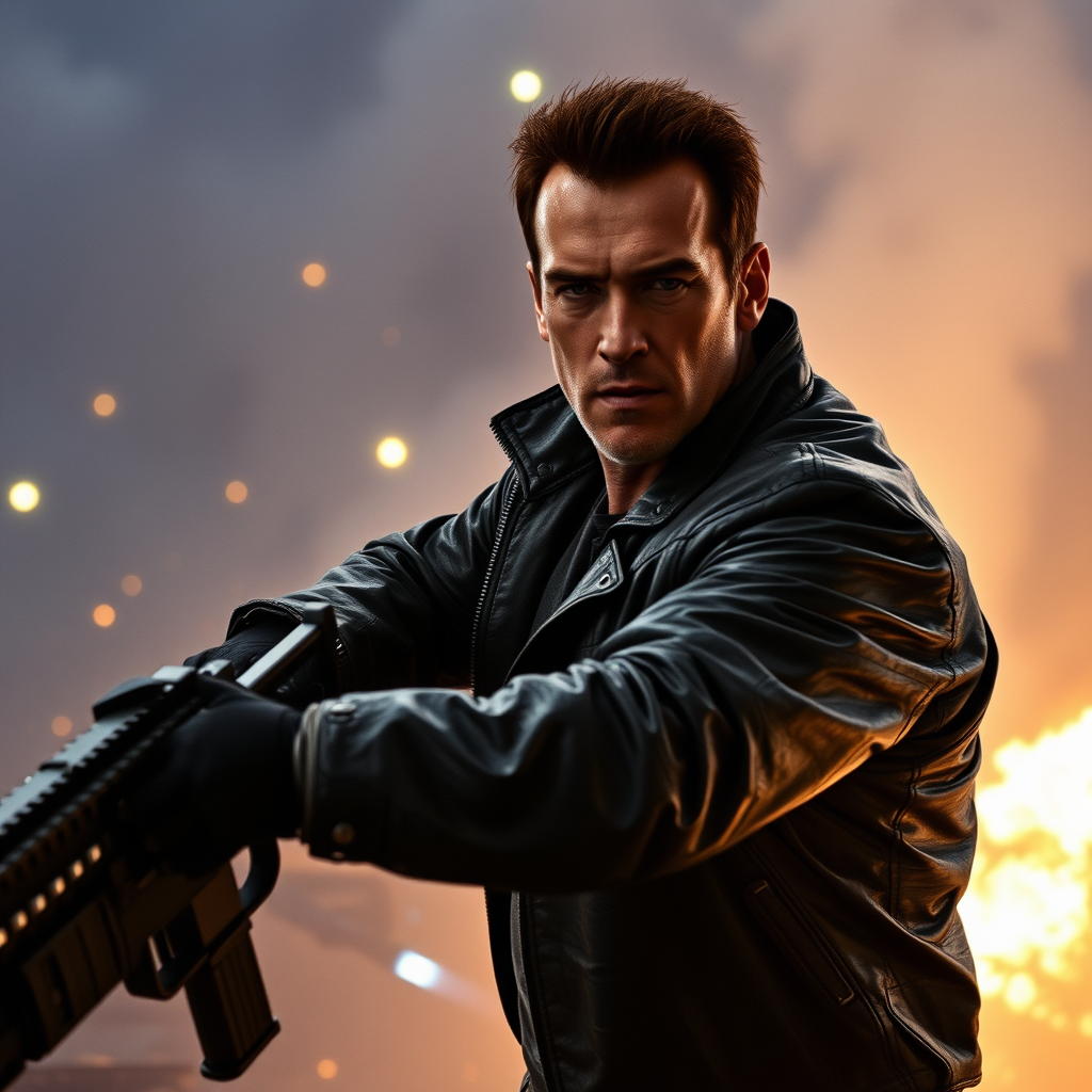 A still image depicts a futuristic, action-packed scene from the 2003 live-action movie featuring Arnold Schwarzenegger as a battle-worn cyborg warrior. Directed by Jonathan Mostow, the shot captures Schwarzenegger in a leather jacket, wielding a heavy weapon amidst a chaotic, dystopian landscape shrouded in smoke and flickering neon lights. Despite small explosions in the background, his unwavering, determined expression showcases both his human and machine elements, embodying a relentless protector in a world on the brink of collapse.
