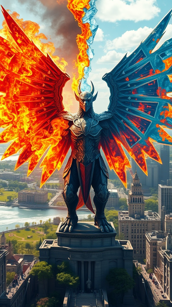 A stoic elemental sentinel stands as a guardian of both destruction and preservation, with one side engulfed in wild, dancing flames and the other encased in glistening ice armor. This majestic creature spreads its wings within a city caught between a raging inferno and a frozen expanse. On one side, human activity thrives amidst clear weather and calm oceans, where green landscapes meet serene skies bathed in direct sunlight. Colorful flora and ordinary wildlife abound, blending seamlessly with the mundane rhythm of city life and functional technology. Unaffected buildings rise asymmetrically, each bearing witness to the elemental contrast. The sentinel embodies the eternal battle between heat and cold, a living testament to nature's dual power of creation and destruction.