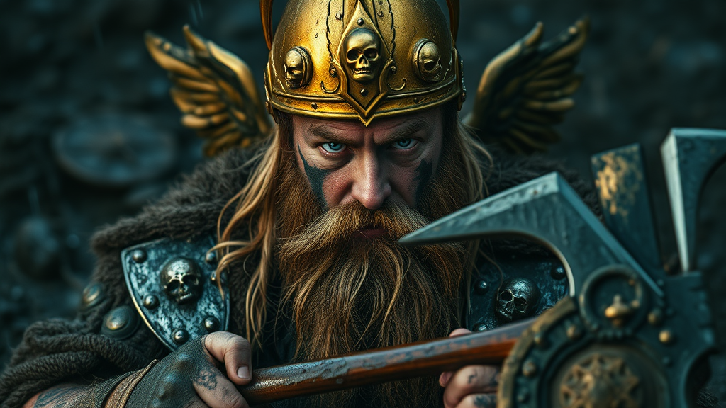 A stoic Viking king rises from the dark mire, his golden helmet adorned with majestic wings, glistening under a veil of damp earth. His war armor, embellished with ominous skull motifs, clangs softly as it meets the ground. Dark war paint streaks across his face, accentuating his fierce blue eyes and scruffy, rain-soaked blonde beard. An angry determination is etched in his expression, further deepened by a jagged scar that slices across his weathered cheek. In his strong hands, he grips a mighty Viking axe, its blade reflecting flashes of moody, cinematic lighting. Volumetric light filters through the misty atmosphere, illuminating the dripping mud that clings to him, capturing the raw essence of a legendary warrior.