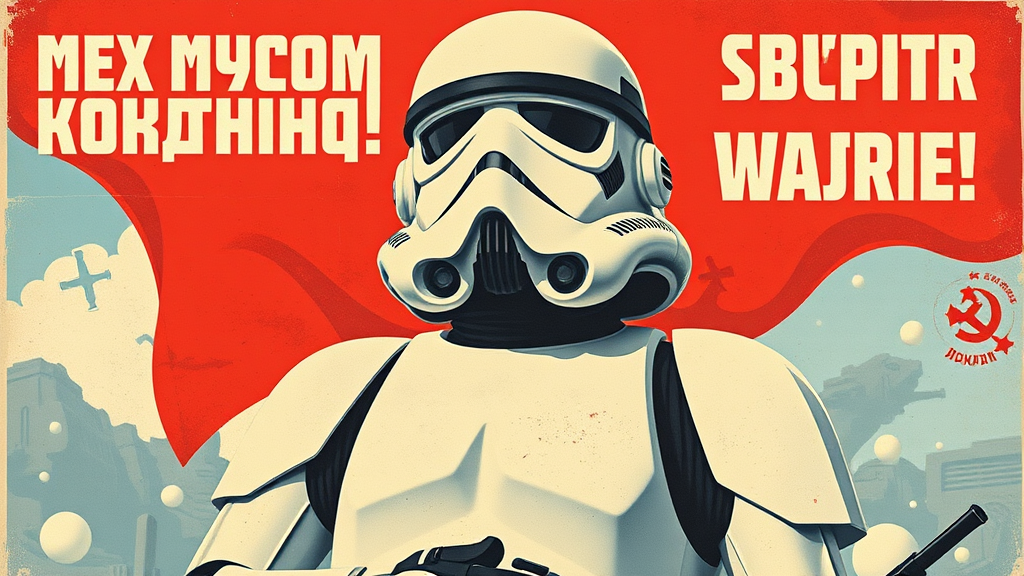 A Stormtrooper highlighted in a Soviet-style propaganda recruitment poster with vivid colors and striking design elements; the symbol integrated; standing proudly in full armor; motivational slogans promoting unity and strength; retro aesthetic; iconic imagery; delivering a powerful message; visually captivating and thought-provoking.