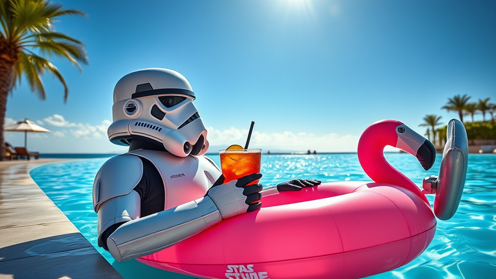 A stormtrooper lounging in a luxury pool, sipping a vibrant cocktail, wearing an inflatable flamingo ring under a bright, sunny sky, surrounded by palm trees and sparkling water.
