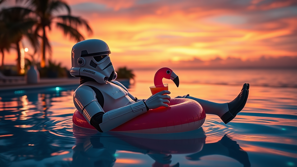 A stormtrooper lounging in a luxury pool, sipping on a cocktail, wearing an inflatable flamingo ring with a futuristic twist, surrounded by shimmering water reflecting a vibrant sunset, palm trees in the background, and neon lights casting a gentle glow, hinting at a tropical paradise vibe.
