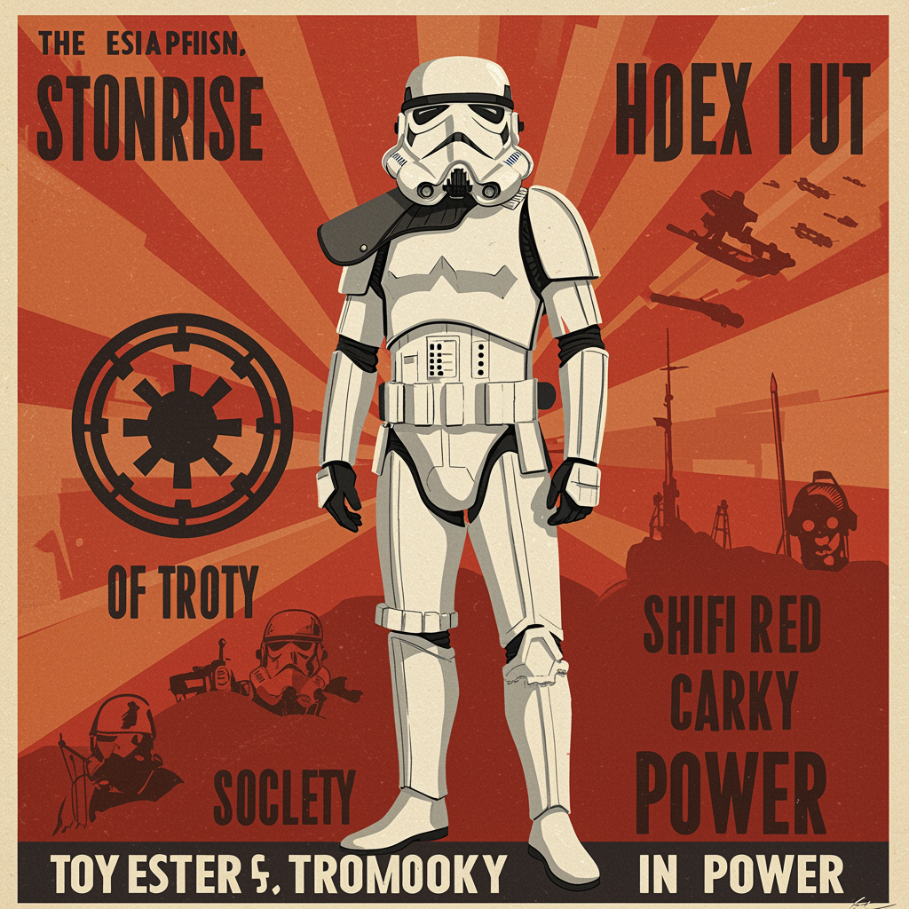 A Stormtrooper showcased in a vintage Soviet-style propaganda poster, featuring bold and vivid colors with striking design elements. The iconic Imperial symbol is seamlessly integrated into the artwork. The Stormtrooper stands proudly in full armor, embodying strength and unity. Inspirational slogans surround the figure, promoting solidarity and power. The retro style evokes a sense of nostalgia, with iconic imagery delivering a powerful, thought-provoking message that is visually compelling.
