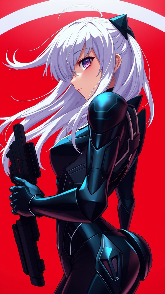 A striking 1girl with an intricately detailed and beautiful face and eyes, featuring flowing white hair, adorned in a sleek black mecha suit. She's posed in a side view, holding a gun, against a vivid red backdrop with a minimalistic design. The scene embraces fisheye perspective, delivering a masterpiece-quality, official art aesthetic that is both beautiful and visually captivating, characterized by animation-style elements and an elegant yet dynamic posture.