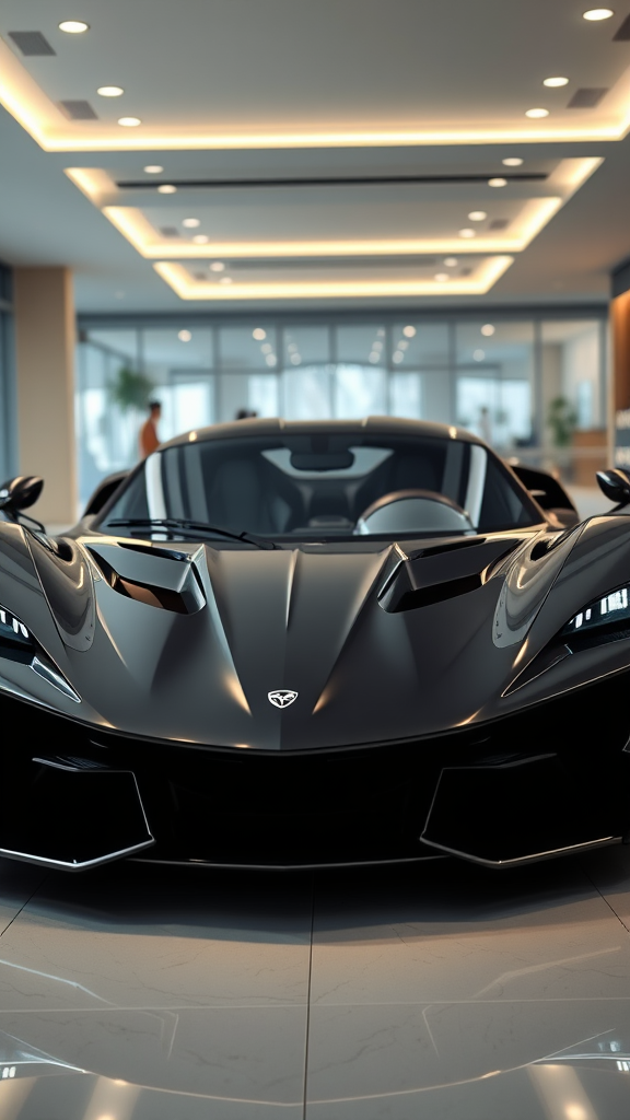 A striking 2023 supercar with a sleek black body and shimmering silver trim, captured from the front view in a luxurious showroom setting. The pristine showroom lights illuminate the car's contours, highlighting its aerodynamic design. Rendered using Unreal Engine 5, the image boasts photorealistic quality in 8k, 16k, 4k, and HD resolutions, with Unreal Engine 4k integration. Advanced ray tracing technology creates stunning reflections on the car's polished surface, achieving a hyper-realistic level of detail—even at 1080p. Subtle creative adjustments include unique LED headlight designs and a distinctive grille pattern, enhancing the car's futuristic appeal.