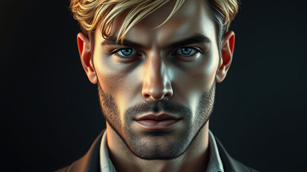 A striking 8k resolution concept art portrait of a man with dark blond hair and a prominent nose, his face clean-shaven and etched with intricate details. He wears stylish attire, capturing both his upper body and head and shoulders with a serious expression. The portrait is infused with dynamic and volumetric lighting, showcasing a triadic color palette. Inspired by the hyperdetailed, intricately crafted style of artists like dmc_kay and WLOP, the portrait is enhanced with a nuanced play of light and shadow, and a subtle splash of artistic flair, making it a trending piece in the art community.