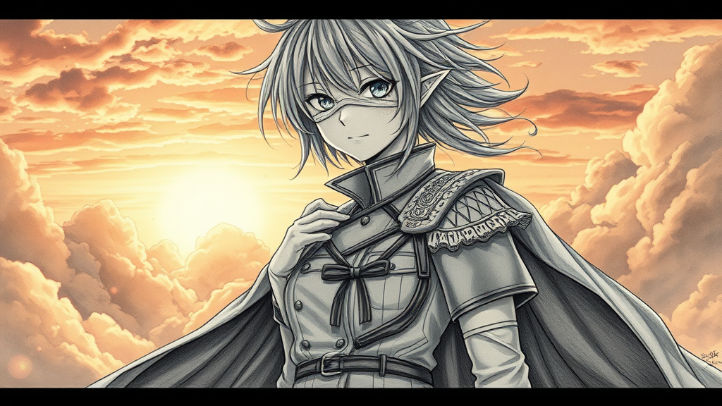 A striking 8k wallpaper featuring an intricately detailed pencil drawing of a female character standing amidst a cloud-filled sky at sunset. Her disheveled hair adds a dynamic element as she gazes directly at the viewer, her face a masterpiece of delicate beauty. Dressed in a military uniform adorned with lace and ribbons, a cape flows dramatically behind her. One eye is obscured by a bandage, evoking a sense of mystery and sadness. Light particles dance around her, enhancing the depth of the scene. Her detailed eyes and the subtle motion of her stance create a powerful presence. Stockings and white gloves complete her outfit, with her refined fingers adding to the elegance. The composition captures the essence of both battlefield strength and vulnerability, set against a backdrop of incredible detail and depth, creating an unforgettable visual experience.