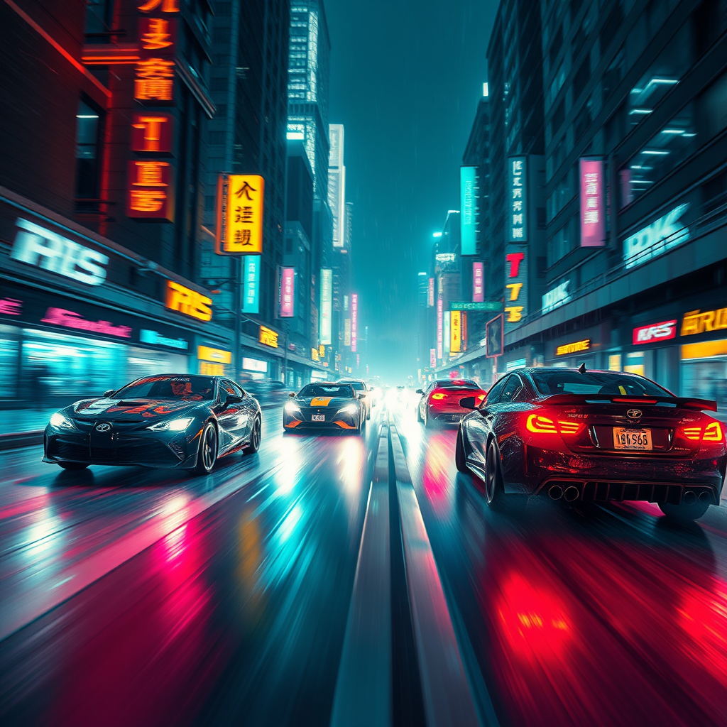 A striking action movie poster showcasing a high-octane race through a neon-lit cyberpunk city at night. The cars are zooming through rain-soaked streets at such incredible speeds they appear as vibrant blurs, adding dynamic motion to the scene. The backdrop features a stunning bokeh effect, with extreme attention to detail captured through cinematic lighting. This raw, candid shot resembles a studio production, highlighting the intense racing atmosphere in 8k UHD and HDR. The visual richness and color vibrancy are reminiscent of a film shot on FujiFilm XT3 with color graded Portra 400 film, emphasizing remarkable detail and depth. The overall composition conveys a gripping sense of speed, enhanced by the realistic cinematic quality, yet steers clear of digital enhancements or poorly rendered elements.