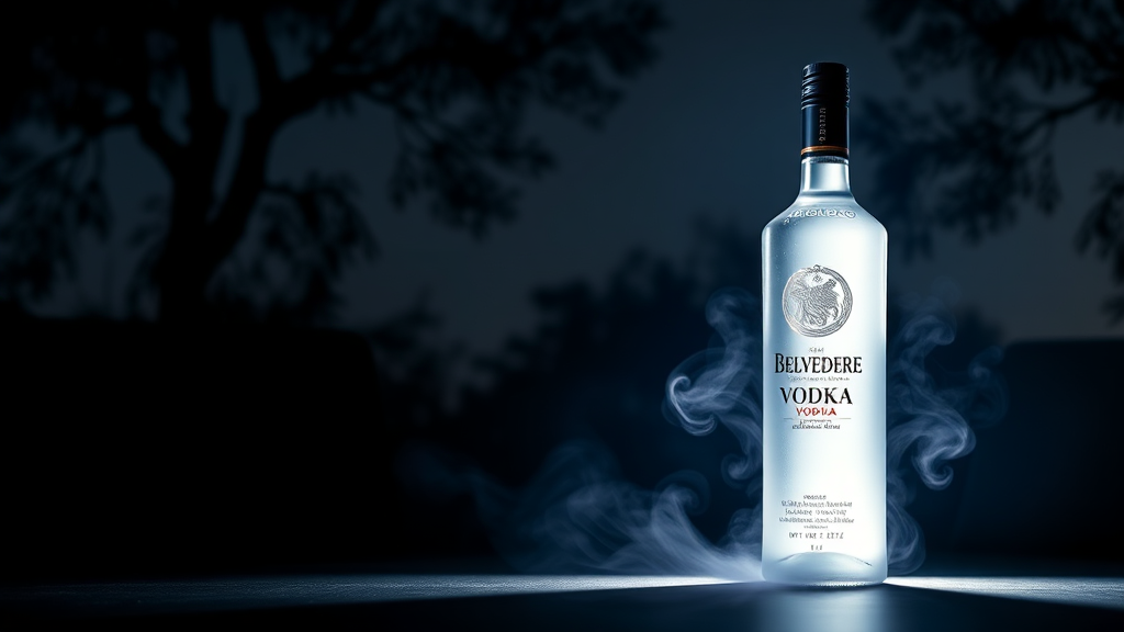 A striking ad campaign for Belvedere Vodka, featuring an elegant bottle of the vodka set against a sophisticated, dimly lit backdrop. The bottle glistens under a soft spotlight, highlighting its sleek design and iconic logo. Around the bottle, a subtle mist swirls, evoking a sense of luxury and refinement. In the background, shadowy silhouettes of gently swaying trees suggest a serene, exclusive outdoor setting. A touch of vibrant color, such as deep blue or royal purple, is subtly integrated into the scene, adding an element of intrigue and allure, while maintaining the brand's classic high-end aesthetic.