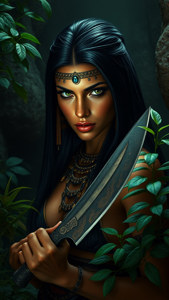 A striking adult Egyptian woman with captivating green eyes and sleek black hair, her face adorned with intricate makeup, gazes intently at the viewer. Her presence exudes strength and mystery, embodying an ancient Egyptian theme as a fierce jungle warrior. Clad in obsidian adornments and wielding a stone knife, she stands amid lush bushes and poisonous plants in a humid, dark chamber. The atmosphere is cinematic, with dim, moody lighting casting shadows over the rocky terrain. There's a nostalgic 1970s film vibe, characterized by high-frequency details captured on 35mm film, accompanied by subtle film noise. The scene is a masterpiece, merging ancient themes with the grit of vintage cinema, envisioned through the lens of pixel art.