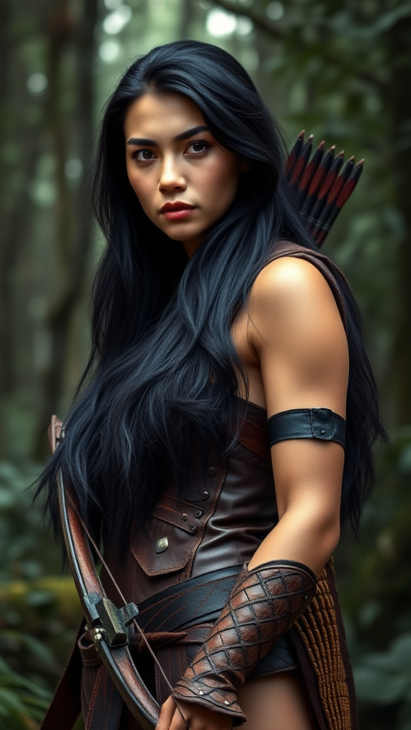 A striking amazon huntress with a sleek bow and arrow stands amidst a dense forest. Her long, flowing black hair frames a face of ethereal beauty, with fair skin and expressive hazel-brown eyes. Her features are impeccably symmetrical and angelic. The huntress gazes intently into the camera, showcasing her well-proportioned face and physique. She is clad in exquisitely detailed leather armor, designed with intricate patterns, accentuating her arms and limbs that reflect perfect proportion and strength. The scene captures her from the waist up, emphasizing the craftsmanship of her gear and weaponry. The setting exudes ultra-realistic, cinematic quality, with soft, overcast lighting that plays with reflection mapping, casting authentic shadows. The composition is precise, inspired by high-definition photography and advanced VFX post-production techniques, including depth of field and cinematic noise, creating a photorealistic image with cutting-edge RTX ray tracing effects, resulting in a breathtaking, movie-quality portrayal in 8k resolution.
