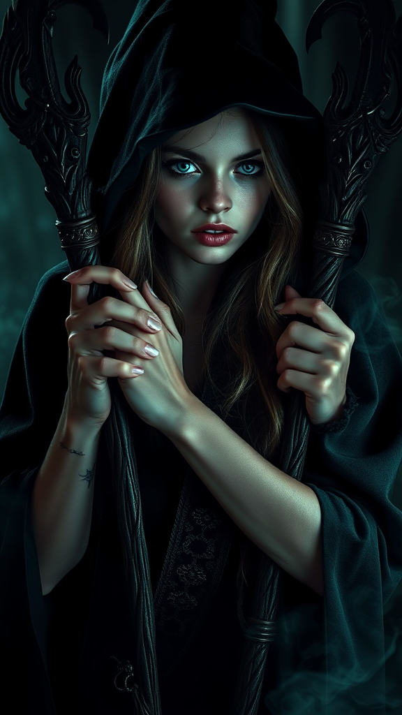 A striking American girl in dark witch attire, featuring a long cloak and a menacing staff, deep blue eyes glinting amidst greenish lights and eerie shadows. The atmosphere is spellbinding, with notable attention to detailed hands and photorealistic elements. Her tattoo adds to her mysterious allure. The photography captures sharp focus, highlighting her beauty and mystique while avoiding any depiction of poorly drawn or distorted features, ensuring a captivating and immersive visual experience.