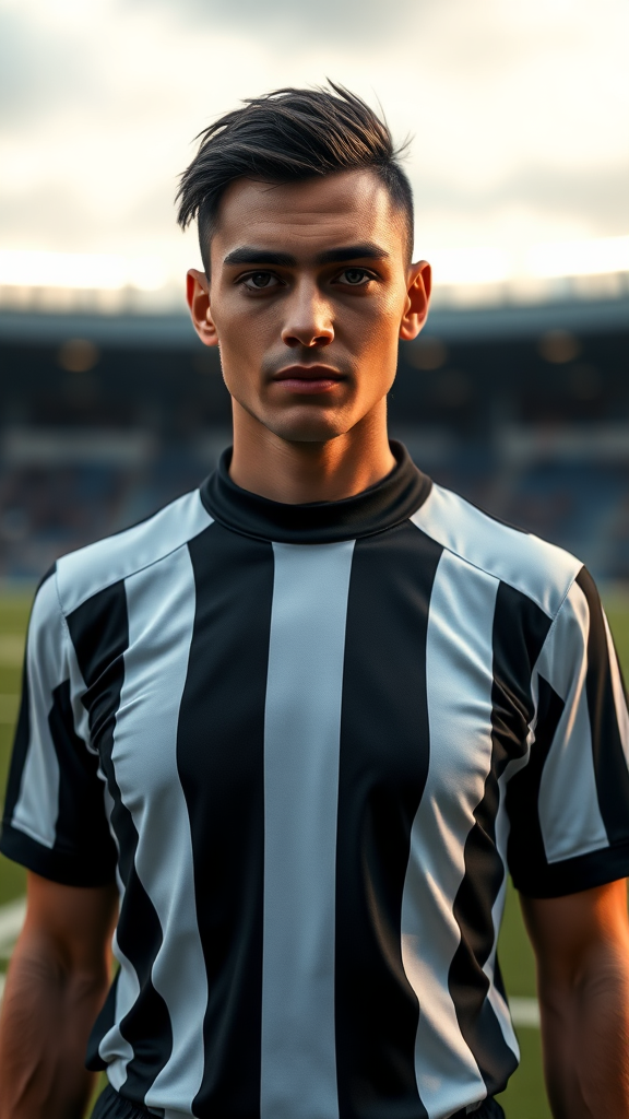 A striking and attractive person dressed as a football referee stands confidently on a football field, perfectly centered. They gaze directly at the camera, presenting a portrait that features detailed, realistic skin and a photo-realistic allure. Captured in 8k resolution, the image boasts a high level of detail with a full-length frame in high detail RAW color. The atmosphere is enhanced by diffused soft lighting and a shallow depth of field, bringing the subject into sharp focus. The hyperrealism and cinematic lighting give the scene a CGI-like quality. The composition avoids any distractions such as text, errors, low resolution, or blemishes. There are no elements of poor quality, duplication, or distortion. The focus remains on capturing natural proportions and expressions without any anomalies such as extra limbs, disfigurement, or poorly drawn features, ensuring an elegantly composed and well-balanced visual.