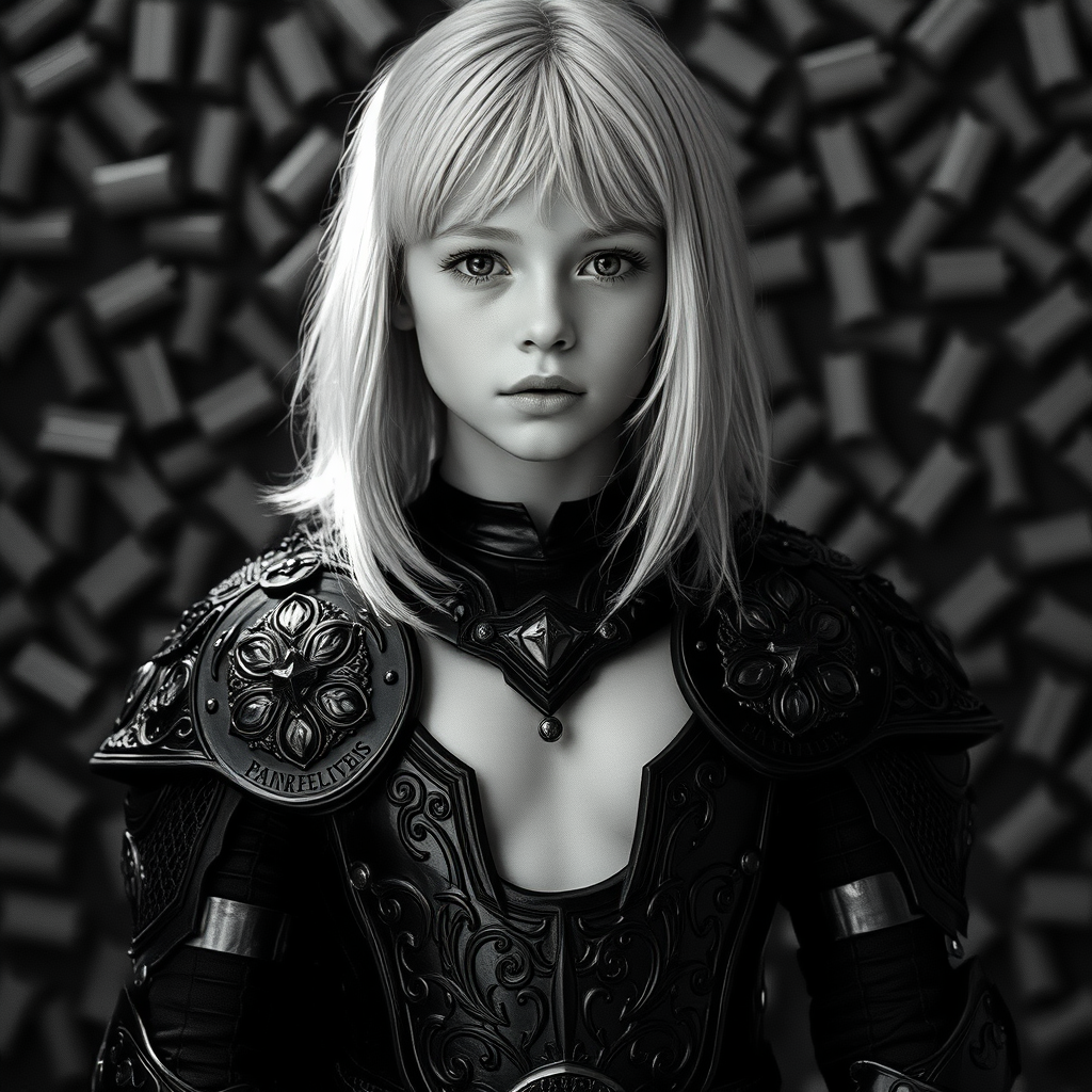 A striking and captivating image featuring a young girl adorned in intricate black armor, exuding strength and elegance. Her medium-length white hair frames a gorgeous, detailed face with soft features and a confident expression. She flaunts a toned stomach with a hint of midriff revealed. The composition is artfully arranged following the Rule of Thirds, with pain relievers subtly integrated throughout the background in an overlapping pattern, enhancing the complexity of the scene. The photography is award-winning, utilizing Ilford HP5 film for a rich black and white aesthetic with crushed blacks and a dramatic depth of field. The natural light casts intriguing shadows and the film grain adds texture, creating a dark yet captivating atmosphere. The scene has a high level of detail, ensuring each element stands out clearly amidst the shadows.