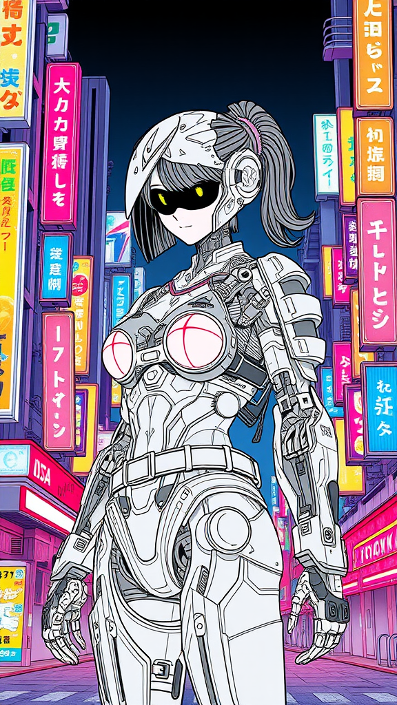 A striking and combat-ready female cyborg stands centered against a vibrant downtown Tokyo backdrop, illuminated by neon lights. Her design features intricate, precise line art that showcases breathtaking beauty and complexity. The scene captures a cinematic quality reminiscent of Studio Ghibli with the adventurous essence of "Breath of the Wild." Meticulous details highlight the cyborg's sophisticated aesthetics in an 8k resolution, while avoiding imperfections such as anatomical inaccuracies or artifacts. Despite its complexity, the artwork maintains clarity and cohesion, celebrating the harmony between advanced technology and the bustling urban landscape.