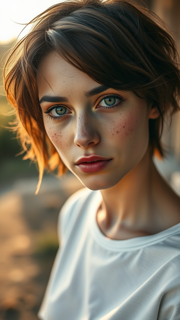 A striking and lifelike portrait of a woman with a sprinkle of freckles, expressive round eyes, and tousled short hair captured in an outdoor setting, dressed in a simple white tee. She gazes intently at the lens, her lips slightly weathered, bathed in gentle, natural light. The imagery blends magical realism with a touch of drama, enhancing the photo-realistic detail. It maintains an intimate and personal composition, akin to a photograph taken with a Leica 50mm lens at f1.4. Subtle yet imaginative elements include a soft breeze ruffling her hair and a warm, golden hue from the late afternoon sun, enriching the visual narrative.