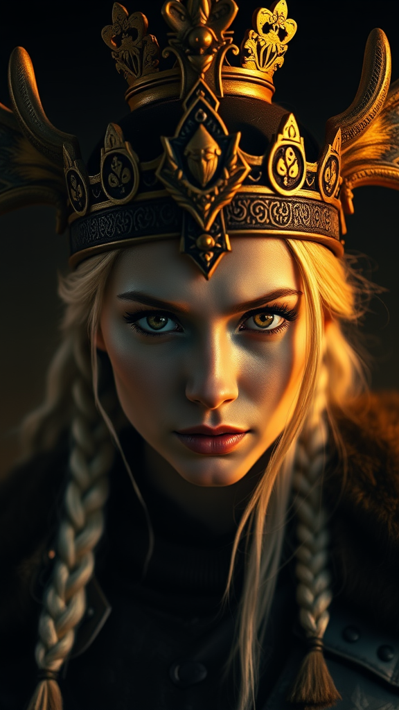 A striking and realistic photograph of a fierce Viking warrior princess adorned in elaborate dark armor, featuring an enormous and intricate moose crown paired with a splendid golden tiara. Her style blends tribal and barbarian elements with a hint of Victoria's Secret allure. Her armor is covered in complex symbols, accentuating her regal presence. Her face, perfectly symmetrical, reveals an impressive beauty with expertly braided platinum blonde hair cascading gracefully. Her eyes are symmetrical and intensely realistic, set against a backdrop of her pale skin, illuminated by the warm, ambient glow of the night setting. She gazes directly into the camera with an expression of confidence and pride. The image captures a medium close-up with a photorealistic quality achieved by a Canon 5D and a 100mm lens, emphasizing hyper realism and intricate details through award-winning, hard rim lighting photography.