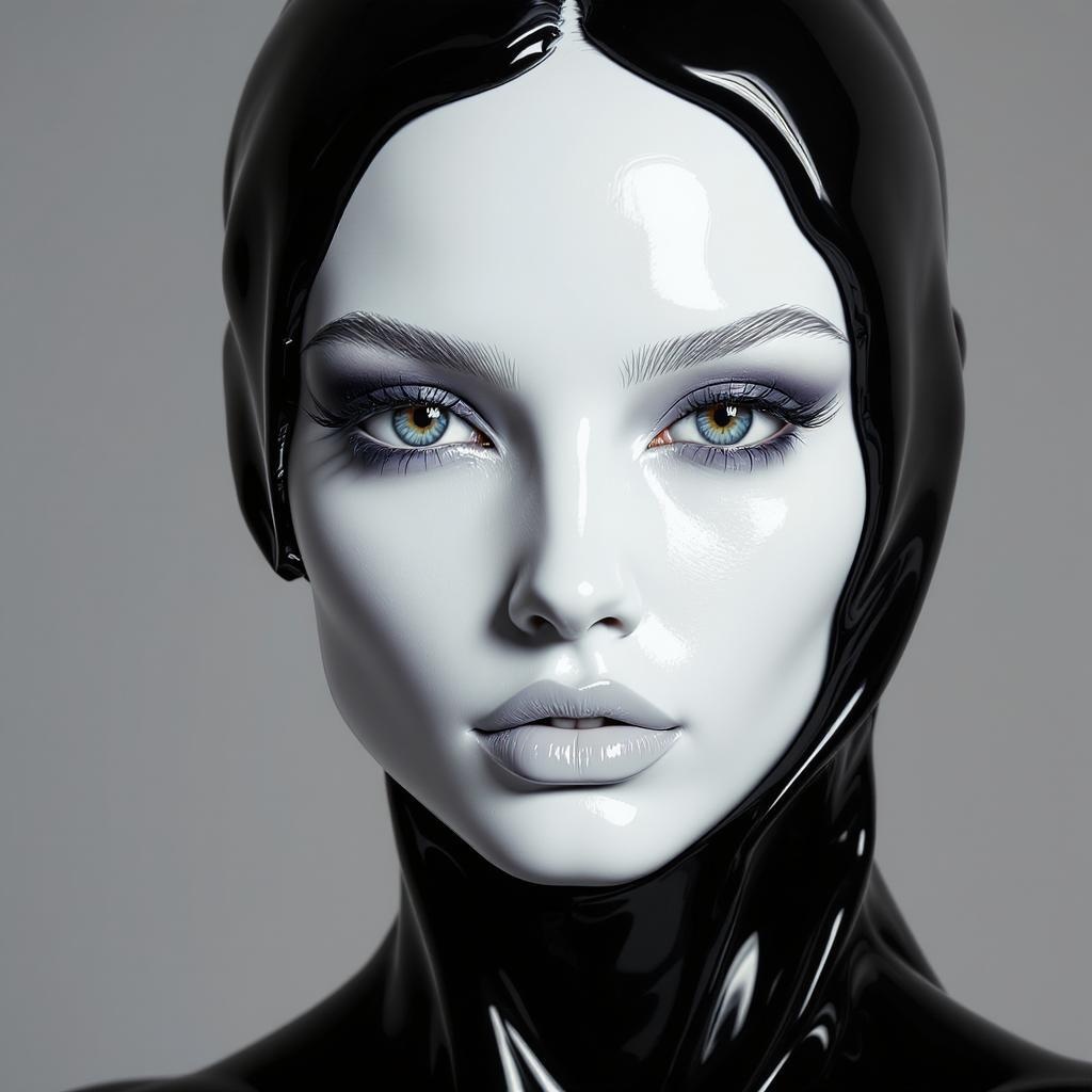 A striking artistic vision featuring a futuristic and surreal image of a female supermodel with an exquisitely symmetrical face rendered in glossy ceramic. Her deep, captivating eyes are accentuated by the smooth, silken flow of glossy black oil that contrasts with her delicate ceramic visage. The coordinated colors create a vivid yet simple masterpiece, capturing modern simplicity and profound visual impact. Bright lighting highlights the interplay between the dark, viscous liquid and the ethereal white of the ceramic, in a fantasy style rendition that evokes a world beyond reality. The front view offers an artistic close-up, immersing the viewer in a mesmerizing blend of surrealism and fantasy.