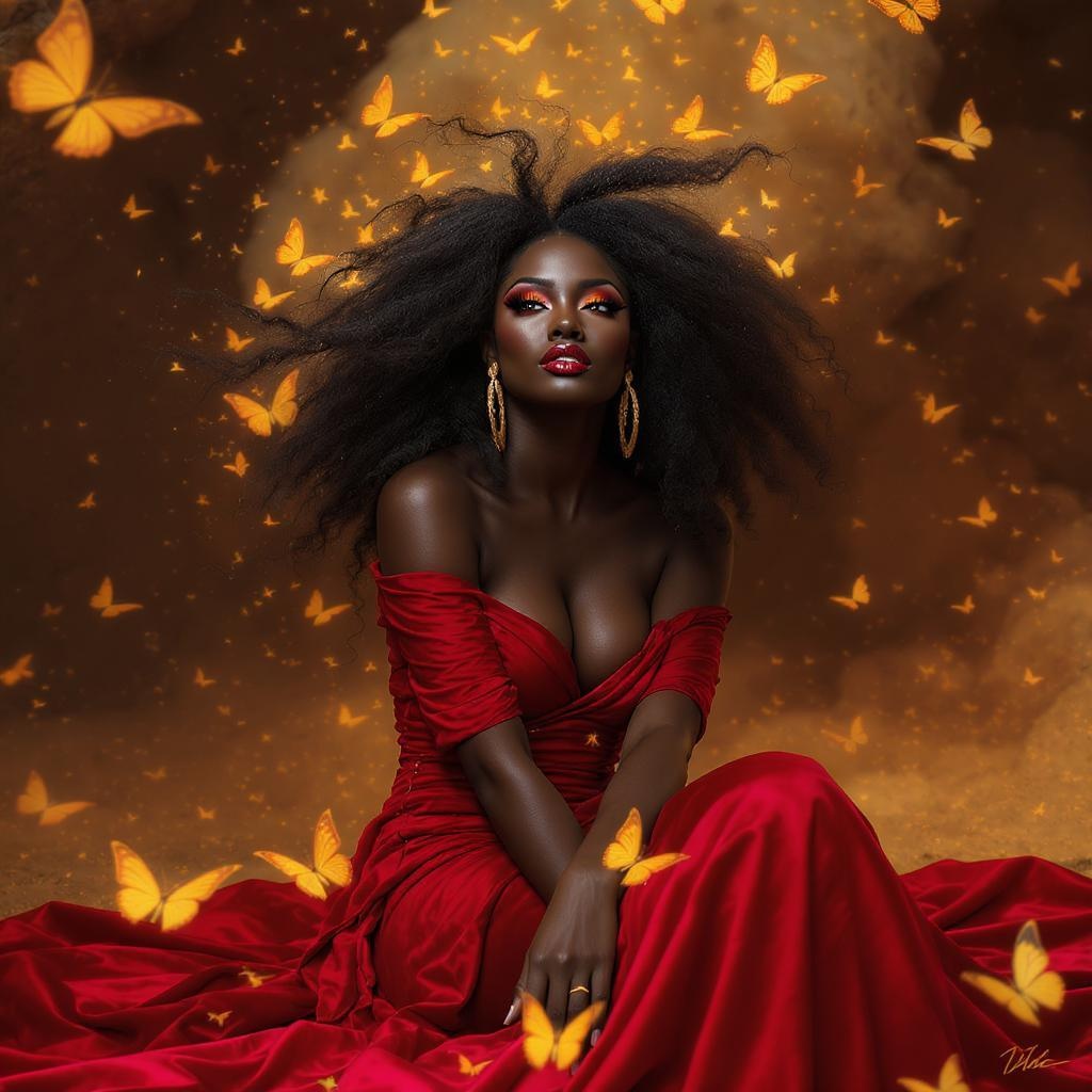 A striking black African goddess with rich, dark skin sits gracefully on the ground, enveloped in a flowing, vibrant red dress. Her presence exudes the essence of love and regality, embodying an African queen's elegance. Swirling around her are ethereal butterflies, their wings flickering like flames, showcasing her divine connection to the butterfly goddess of fire. Her eyes sparkle with wisdom and strength, reminiscent of an African princess inspired by the artistry of Thomas Blackshear and Rob Rey. This afrofuturistic vision is imbued with the essence of black art, capturing the stunning beauty and power of this black woman, the embodiment of grace and divine femininity, reminiscent of works by Lily Delissa Joseph and Eddie Mendoza. The scene is a harmonious blend of tradition and innovation, a tribute to the timeless African spirit.