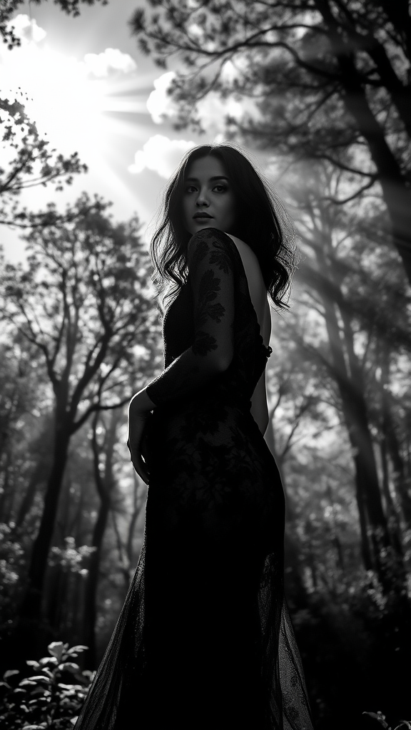 A striking black and white fashion editorial captures a stunning dark-haired woman enveloped in a delicate dark lace gown, set against the enchanting backdrop of a sunlit forest. The scene is animated by radiant beams of light piercing through the canopy, juxtaposed with a dramatic, cloud-kissed sky. The play of light and shadow adds depth and intrigue to the high-resolution, lifelike photograph. Shot from a cinematic angle, the composition is further enhanced by dynamic backlighting that accentuates the model's grace and the dress's intricate details, creating a harmonious blend of natural beauty and high fashion.