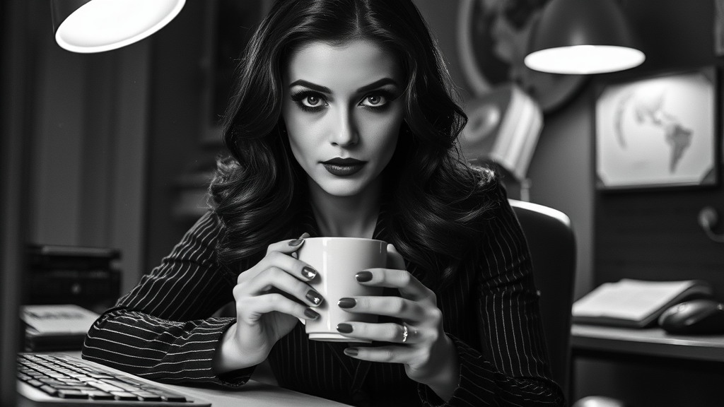 A striking black and white film captures a high-contrast, full-body scene of an enchanting 1940s noir detective woman, known as the most beautiful detective in the world. Seated at her desk, she sips a cup of hot coffee, her luscious long hair framing a symmetrically detailed face. Her dark, reflective eyes are emphasized by dramatic lighting, with rim lighting highlighting her shiny locks. Dressed in pinstripe trousers, her look is completed with subtle makeup. Dust particles dance in the air, illuminated by a ceiling lamp, adding depth to the scene. The black and white photography features a delicate balance of shallow focus and depth of field. Despite the busy tableau—her desk adorned with a keyboard and mouse—there's a sophisticated calm in her poised demeanor, inviting intrigue into the narrative of this private investigator's world.