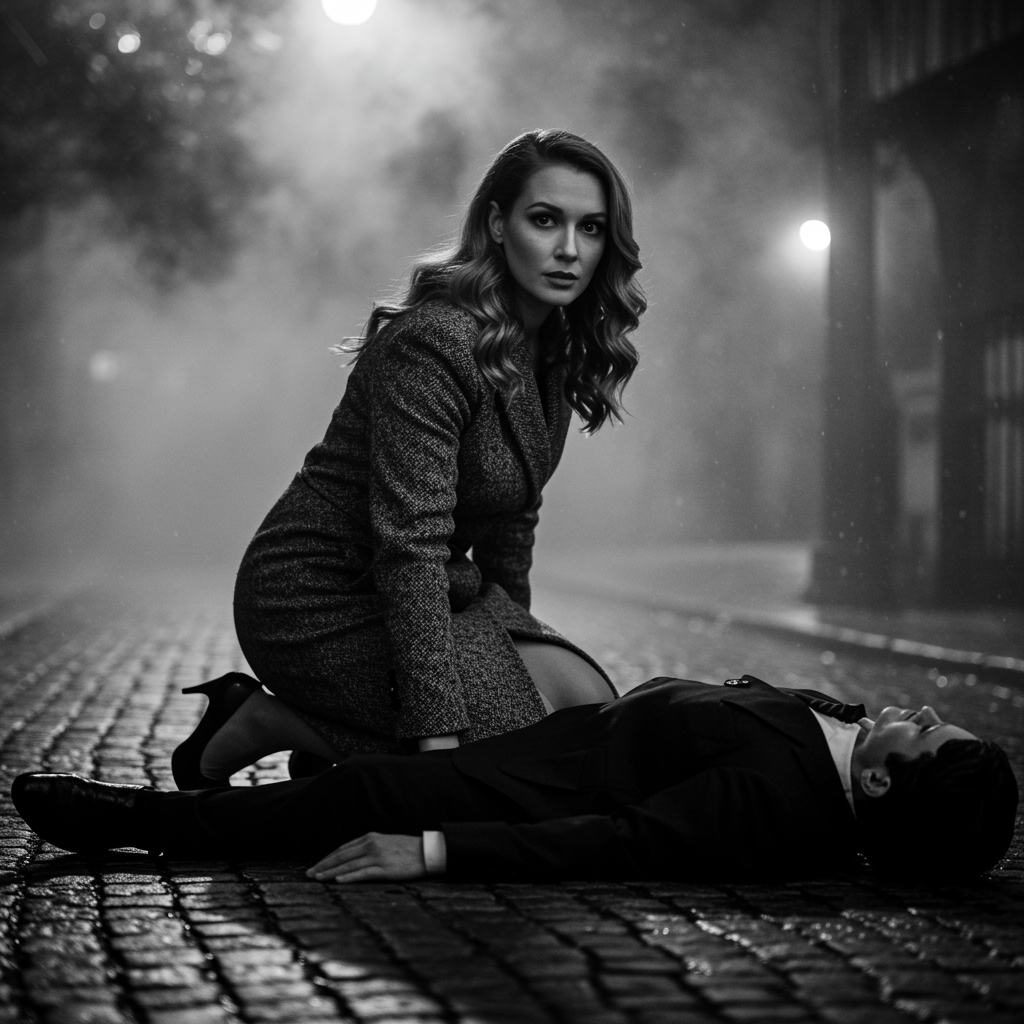A striking black and white film captures a scene straight from the 1940s noir era. The focus is on the most beautiful detective woman, kneeling in high contrast detail next to a lifeless body sprawled out on the rain-soaked street. Her long, shiny hair cascades around her shoulders, framing dark, reflective eyes enhanced by subtle makeup. The setting is moody, with swirling mist and fog under streetlights casting dramatic and detailed rim lighting, highlighting the dust particles in the cold air. Her silhouette clad in a tailored tweed coat emphasizes her slender figure amidst a backdrop of scattered puddles on cobblestones. The scene is meticulously composed with a shallow depth of field, drawing attention to her intense expression. This mysterious detective, exuding elegance and prowess, fits seamlessly into this classic noir investigation, forever frozen in this cinematic moment.