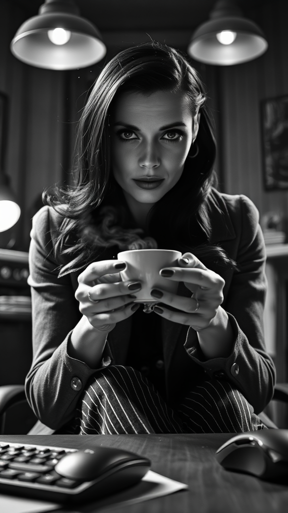 A striking black and white film stock image captures a high contrast, full body movie clip of the world's most captivating detective, a 1940's noir private investigator. She sits at her desk, cradling a steaming cup of coffee, her long shiny hair framing a detailed, symmetrical face. Her dark, reflective eyes are enhanced by subtle makeup, exuding mystery and intensity. Dust particles dance in the dramatic rim lighting, highlighting her elegant pinstripe trousers. The atmosphere is enriched by a singular ceiling lamp and the scattered office essentials—a keyboard and mouse rest nearby. This cinematic scene employs black and white photography, embracing shallow depth of field to emphasize the detective's nuanced expressions. The classic setting evokes an era of intrigue, with artistic choices accentuating the detective's poised and compelling presence.