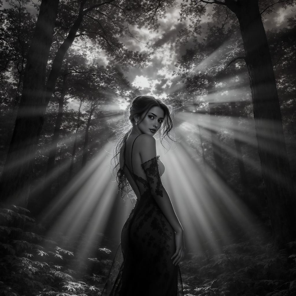 A striking black and white photograph captures a graceful dark-haired woman in an exquisite dark lace dress, standing amidst a sunlit forest. The delicate interplay of light and shadow creates a dramatic scene, as rays of sunlight filter through the canopy, illuminating her serene pose. The sky above swirls with an intense drama, adding depth and contrast to the scene. The image, rendered in high resolution, showcases the artistry of professional photography, utilizing a cinematic angle that enhances the dynamic backlighting.