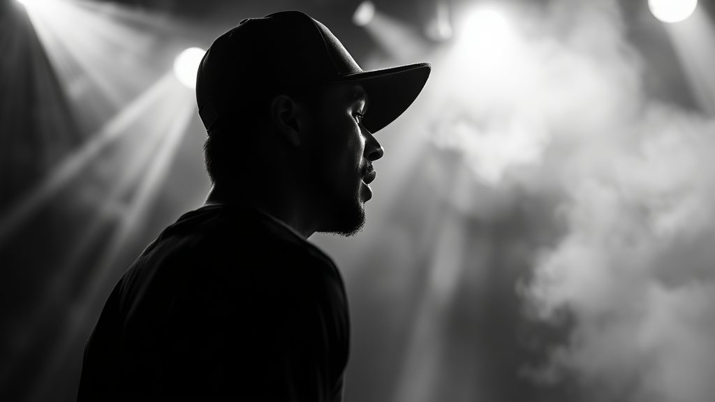 A striking black and white photograph captures a rapper in a baseball cap, his silhouette emerging dramatically from swirling stage fog during a high-energy concert. The side view reveals the raw emotion in his expression as volumetric lighting slices through the mist, casting dynamic beams that accentuate the scene's intensity. The image is composed with a cinematic angle, with dramatic lights creating a play of shadows that enhance the atmosphere, giving a timeless quality to the performance.