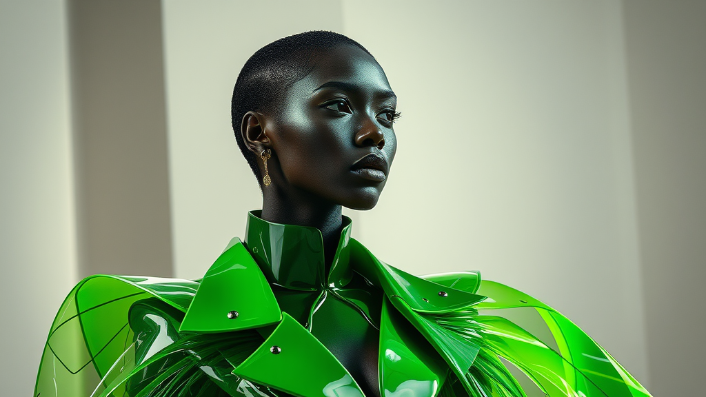 A striking black female model gazes off to the side, clad in opulent, avant-garde attire with a futuristic twist. Her ensemble features a blend of shimmering plastic and sleek latex materials adorned with abstract silhouettes and asymmetrical techno detailing. The design is dominated by a vibrant green palette, exuding a sense of dynamic movement and energy. Her look is reminiscent of Iris van Herpen's visionary style, captured in a 4k cinematic photograph that encapsulates her commanding presence and innovative fashion.