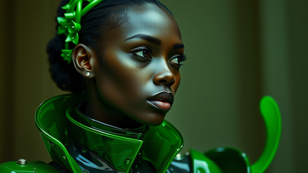 A striking black female model, gazing thoughtfully to the side, adorned in avant-garde and futuristic attire, featuring sleek plastic and glossy latex fabrics, with swirling abstract forms and asymmetric techno embellishments. Dominated by vivid green hues, the ensemble captures cinematic essence in high-definition, reminiscent of Iris van Herpen's visionary style.